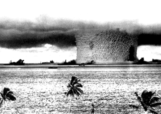 | A shallow underwater burst on the 25th raised the total number sunk directly or indirectly to 32 of the 83 ships of all types used in the tests. Among them were the aircraft carriers Saratoga, sunk in shallow water on the 25th after 19 years of active service, and Independence which was so heavily damaged and contaminated that she was no longer fit for use. Although these tests had broad national impact, to the Navy and to naval aviation they not only made clear the importance of nuclear weapons in control of the sea but they also provided much detailed data on the effects of nuclear blasts and a sound technical basis for intensification of efforts to develop tactics and equipment whereby the damage of such attacks against a naval task force could be held to a minimum. |