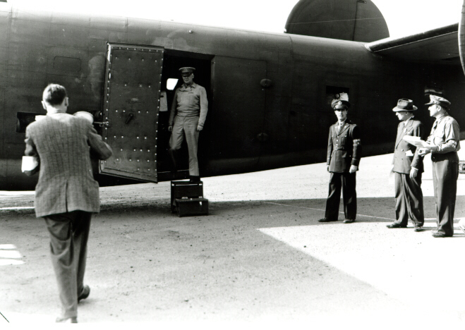 In October 1942, General Arnold's C-87 Liberator, a transport version of the B-24, swooped down onto the flightline after a record-breaking trip from Brisbane, Australia. The general landed just in time to catch 25th anniversary festivities at Bolling Field (commemorating the activation date of October 2, 1917). The Commanding General, Army Air Forces, was met by General George C. Marshall, Army Chief of Staff, and was awarded the Distinguished Service Medal by Assistant Secretary of War for Air Robert A. Lovett. Eleven officers including St. Clair Streett, now a brigadier general and four enlisted members of the flight received the new Air Medal for their heroism. The two-week tour covered 22,000 miles of the South Pacific in 77 hours and 11 minutes. This voyage allowed General Amold a first-hand glimpse of American aircraft in action. A man never content with second-hand information, he preferred to go out and learn for himself whenever possible. |