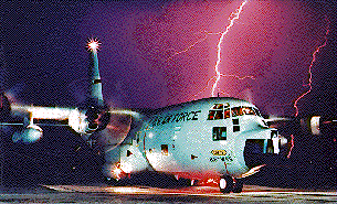 The venerable C-130 Hercules joined weather recce in 1963. At last, using this sturdy, pressurized aircraft, crews could penetrate a hurricane without getting soaked by the heavy rain! The "B" and "E" models of the WC-130 flew many years, and the "H" model continues to fly today. These "Herks" are now over 30 years old, but have proved to be the most dependable of all the aircraft in the pages of weather history. In 1975, a new contender in the exclusive "hurricane hunting" mission arrived: the Air Force Reserve! The 815th Weather Reconnaissance Squadron, "Storm Trackers" was born from a tactical airlift squadron just down the street from the 53rd, and soon both units were sharing the bulk of the hurricane missions (with NOAA flying a few of the storms as well). They soon became all respected counterparts to the active-duty 53rd. |
