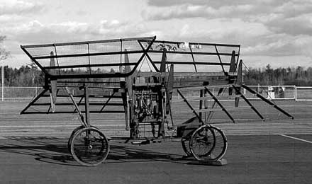 Ornithopters Failed To Prove That Human Beings Could Fly With Their Own Power Ornithopters were designed to fly by flapping their wings like birds using human power, an idea as old as time. James W. Clark, clock maker, bicycle repairman and inventor, of Bridgewater, Pennsylvania. He supposedly tested this machine between 1900 and 1910. The relation in size of humans and their output power and requied power for flight has not been proven. Clarks ornithopter failed to fly, was wrecked, then rebuilt and fitted with the present engine in 1910. Specifications: engine 5 hp. Waterman Motor Company, two-cylinder vertical, water-cooled. |