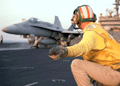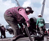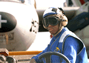 | Much goes into flight operations aboard today's modern Navy aircraft carrier. Preparations for a launch very much resemble a well-choreographed ballet. Those involved in the evolution have specific, clearly-defined roles, and are easily recognizable by the color of their jerseys. | ||||||||||