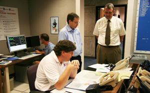 | Senior Hurricane Specialist Jack Beven discusses the forecast track of Hurricane Bill with hurricane specialist unit branch chief James Franklin and NHC director Bill Read | ||||