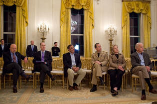 | Seated from left, James Clapper, Director of National Intelligence, National Security Advisor Tom Donilon, CIA Director Leon Panetta, Admiral Mike Mullen, Chairman of the Joint Chiefs of Staff, Secretary of State Hillary Rodham Clinton, and Vice President Joe Biden listen as President Barack Obama makes a statement on Osama Bin Laden in the East Room of the White House May 1, 2011. (Official White House Photo by Pete Souza) | ||||