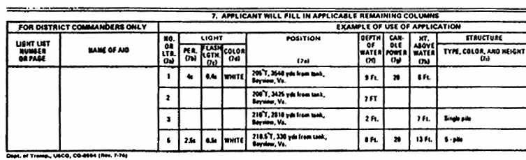 4. The applicant shall complete all of Blocks 1, 2, 3, 4, 5, 9 and 10 for all new applications. When an aid is being discontinued, Block 3 need not be completed. Block 6 shall be completed whenever authorization is required to be obtained from Corps of Engineers (See Instruction Number 3). Columns of Block 7 will be completed as follows: